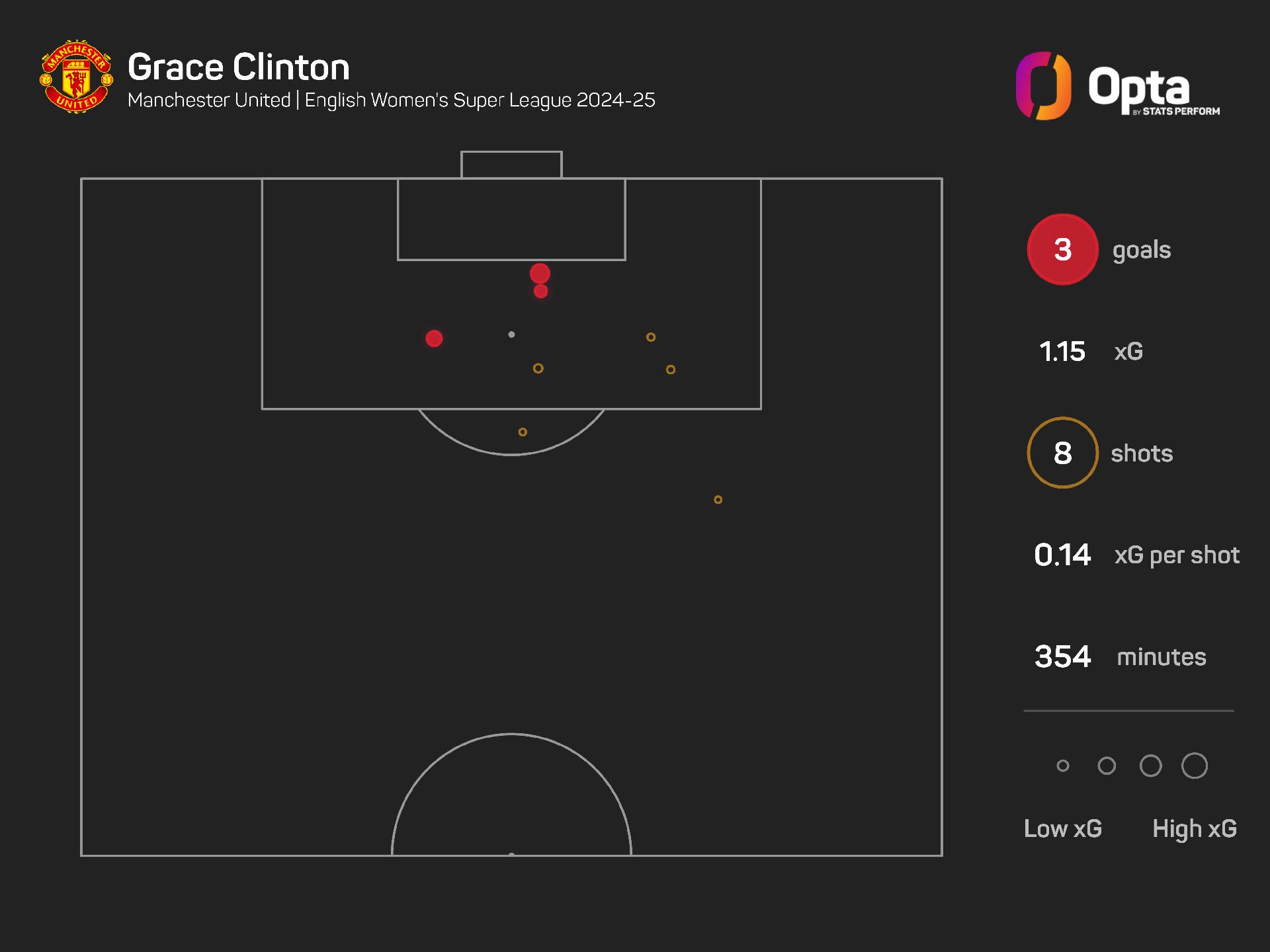 Clinton is also a creator. Though she is yet to provide an assist, she has crafted six chances for her club-mates, with only Ella Toone having set up more among United’s squad (seven).