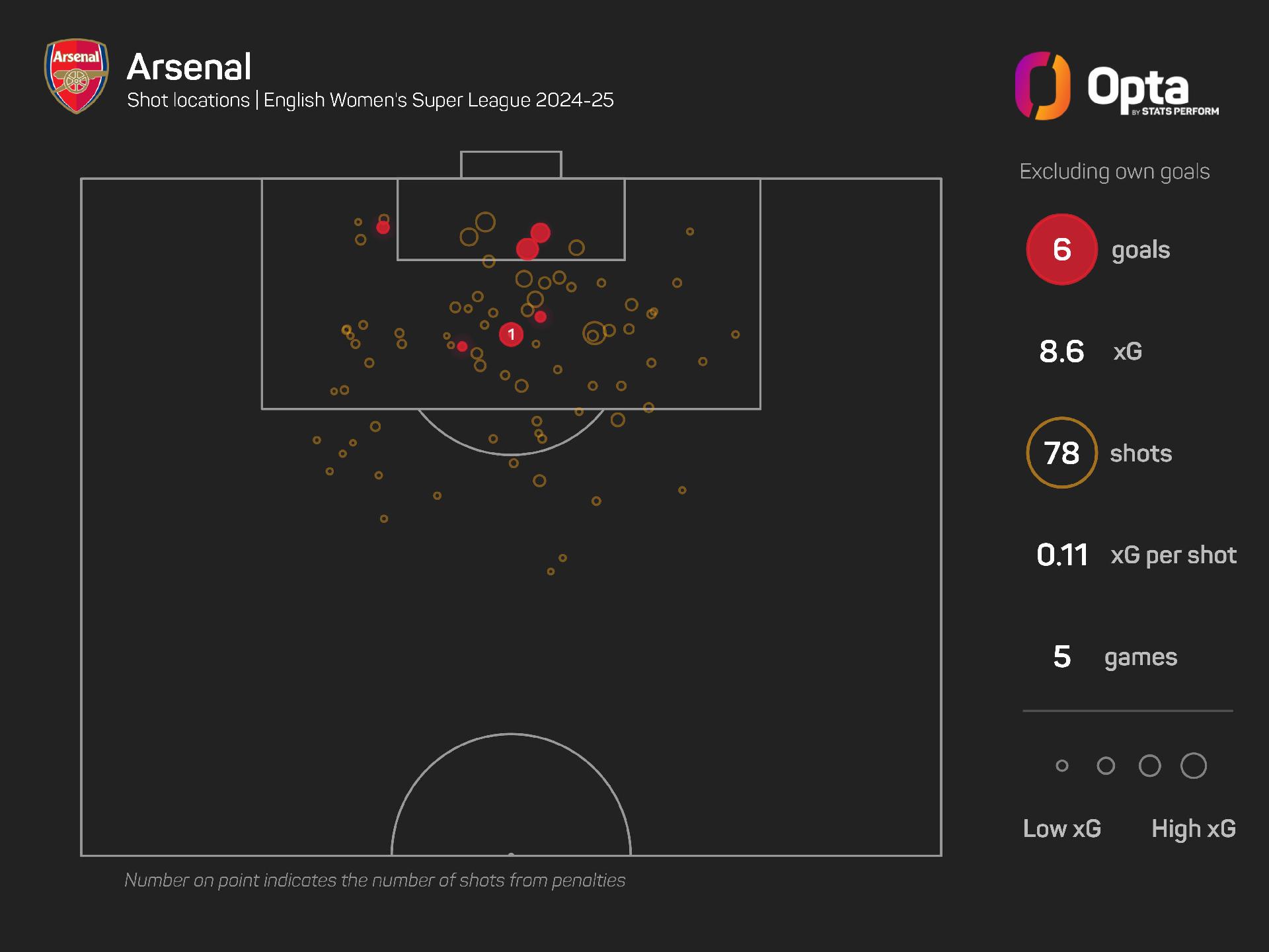 Arsenal have scored six goals from 4.58 xG in their past two matches. Whereas under Eidevall the Gunners were missing chances with regularity, they have seemingly picked up their finishing under interim boss Slegers. They had scored four goals from 7.0 xG under Eidevall in their first four league matches.