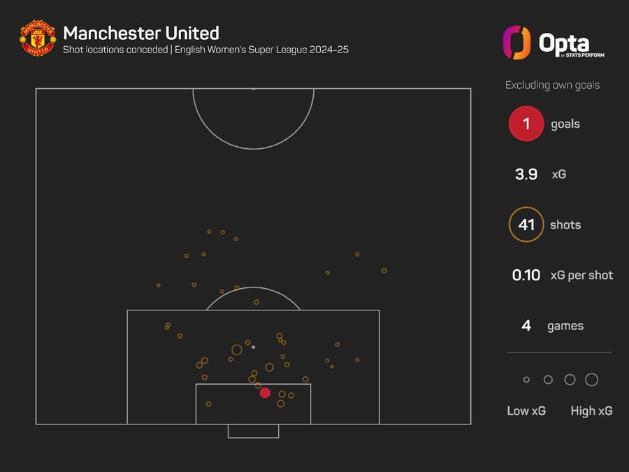 United average 0.98 xGA per game in the WSL this term, while they have faced 10.25 shots per game.