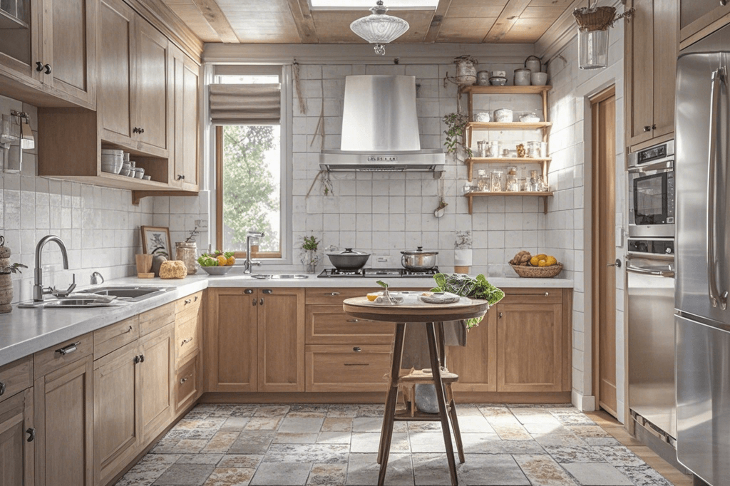 · Materials: Use light woods, white or neutral cabinetry, and simple, durable countertops.