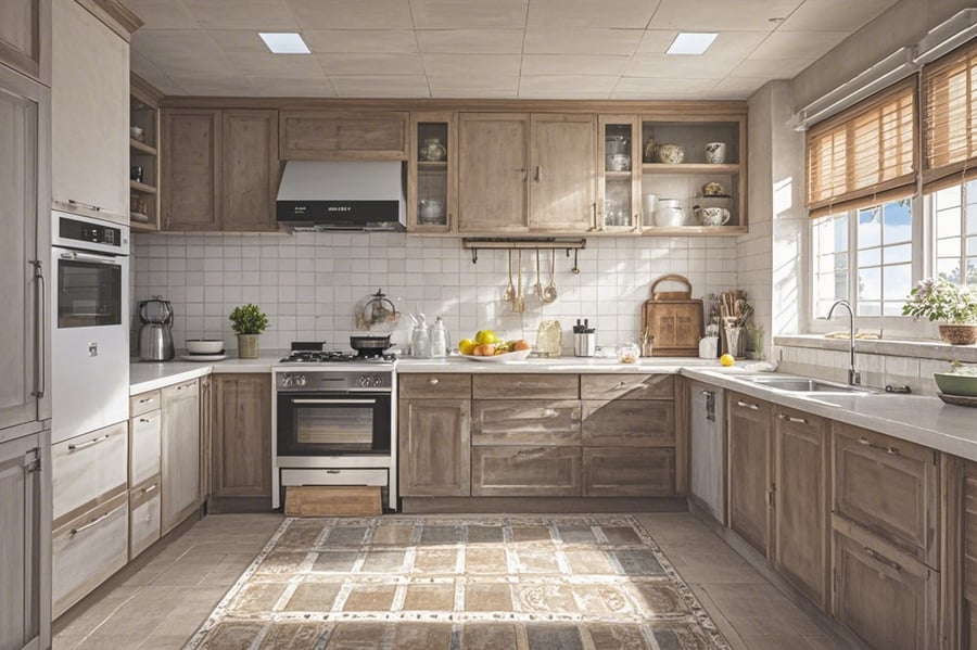· Decor: Add vintage or retro accessories, such as enamelware, mason jars, and antique-style fixtures, to enhance the rustic feel.