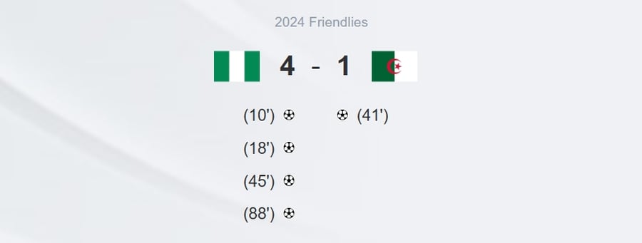 Game is over and the final score is Nigeria 4-1 Algeria. Here is the match report.<h2>2024 Friendlies</h2><h3>Line-ups</h3>NigeriaXI:Subs:AlgeriaXI:Subs: